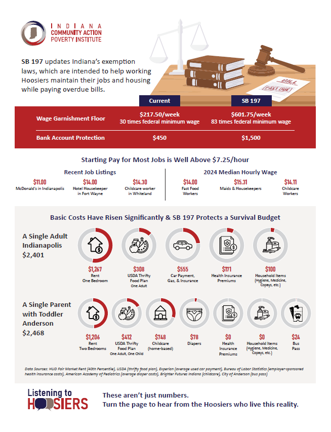 Created in response to SB 197 in the 2026 legislative session, this fact sheet explores the impacts of wage garnishment on hard-working Hoosier families. As costs of living have increased for families, it has become more critical now than ever before to protect wages from garnishment and understand the difficult reality that many individuals already experiencing garnishment have faced.
